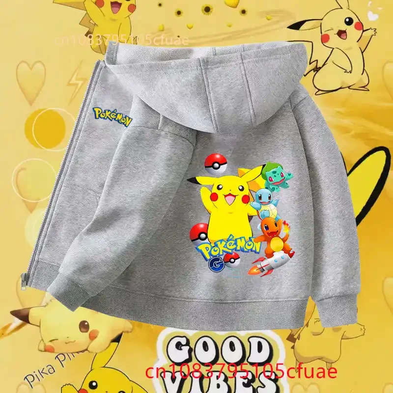 Kawaii Pokemons Gray Zipper Hoodie Set Kid Clothes GirlsClothing Baby Boy Autumn Pikachu Birthday Sweatshirt Children Tops+pants