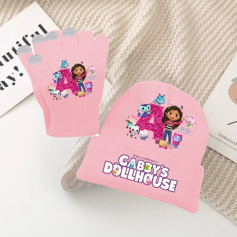Gabby Dollhouses Cute Knitted Hat Gloves 2pcs Set Children Winter Hats Pink Warm Cap Screen Gloved Girls Christmas Birthday Gift