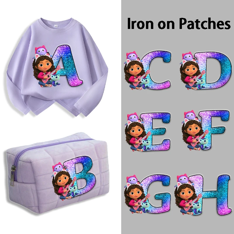 Gabby's Dollhouse Iron on Patches Letter A-Z Printed Girls Birthday Clothes Heat Transfer Stickers Fashion DIY Clothes Handbags