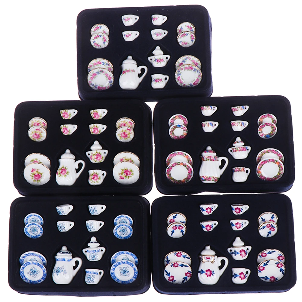 Girls Toys Tea Game Miniature Tea Set Dollhouse Furniture 15Pcs 1:12 Porcelain Cups Flower Tableware Kitchen Decorative Teapots