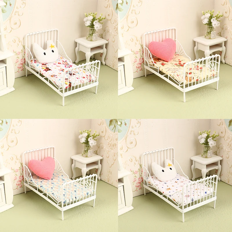 1Set 1:12 Dollhouse Iron European Bed Mini Cradle with Mattress Cushion Ornaments Miniature Furniture Bedroom Decor Toy