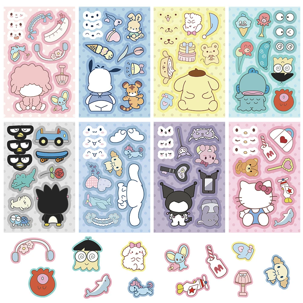 8/16sheets Cartoon Kuromi Pochacco Sanrio Puzzle Stickers Make a Face Children DIY Assemble Jigsaw Decal Toy Kids Party Supplies