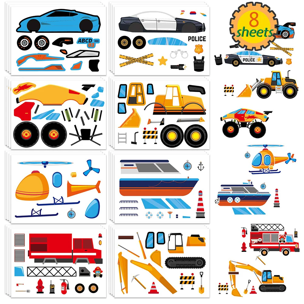 8/16Sheets Children DIY Puzzle Stickers Make Truck Engineering Vehicle Car Funny Assemble Jigsaw Kids Game Educational Toys Gift