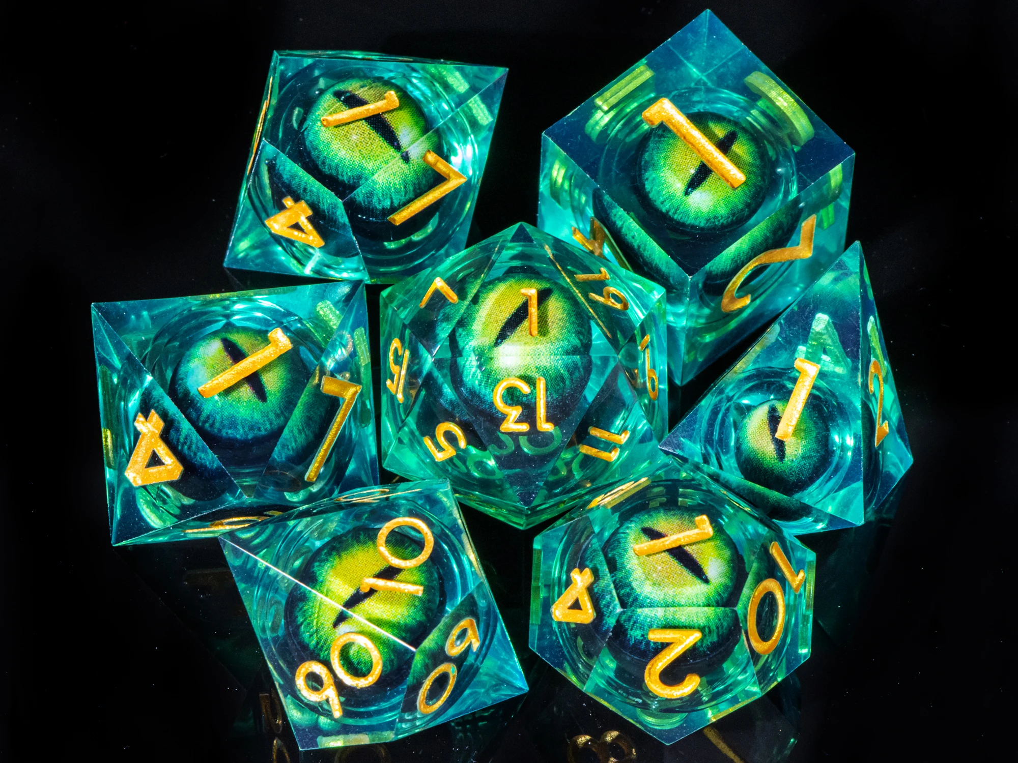 Dragon's eye resin dice, 7PCS Green Liquid Core Dice Set, Sharp Egde polyhedral d and d dice