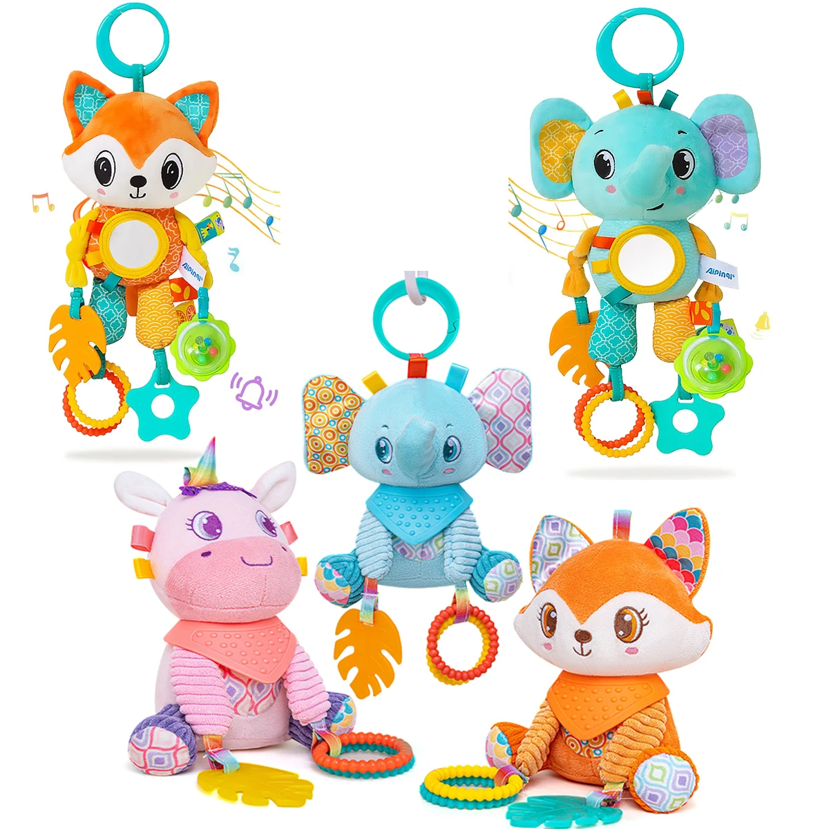 Soft Hanging Crinkle Squeaky Sensory LearningToy Stroller Car Seat Crib Travel Plush Animal Wind Chime with Teether Boys Girls