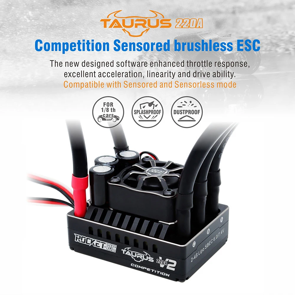 ROCKET-RC 220A Brushless ESC 2-4S Speed Controller 7.4V/6A BEC with Heatsink for 1/8 RC Car Off Road Buggy Replacement Parts