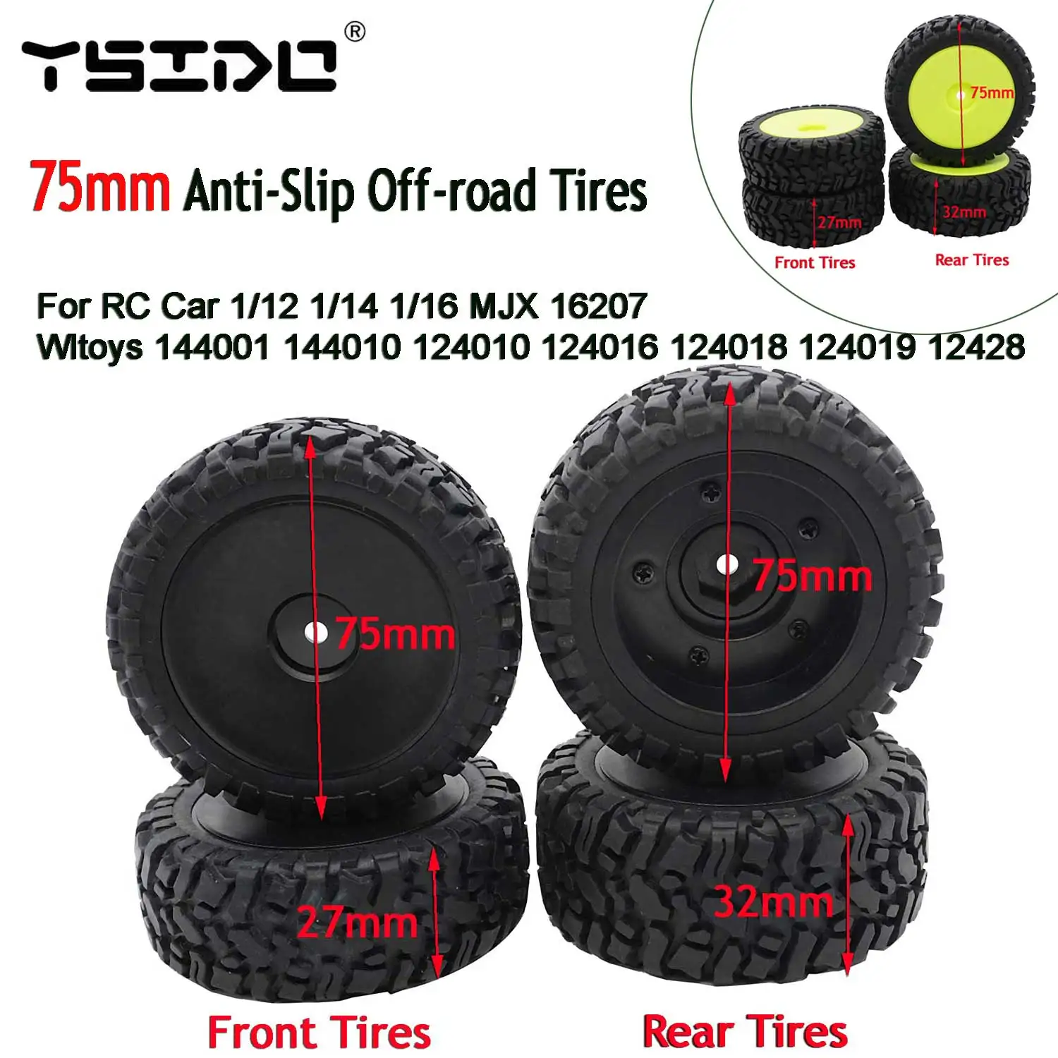 4pcs 75mm RC Car Anti-Slip Off-road Tires for Wltoys 144010 124016 124017 124007 MJX 16207 1/12 1/14 1/16 RC Car Buggy Parts