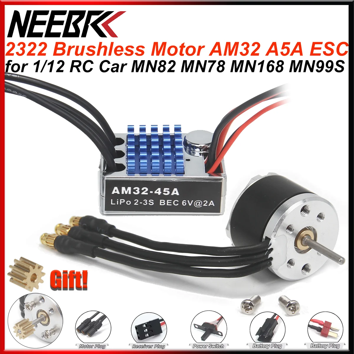 NEEBRC 2322 2600KV Outrunner Brushless Motor AM32 45A T/AM3.0 Plug ESC for 1/12 RC Car MN82 MN99S MN78 MN168 Upgrade Power Kit