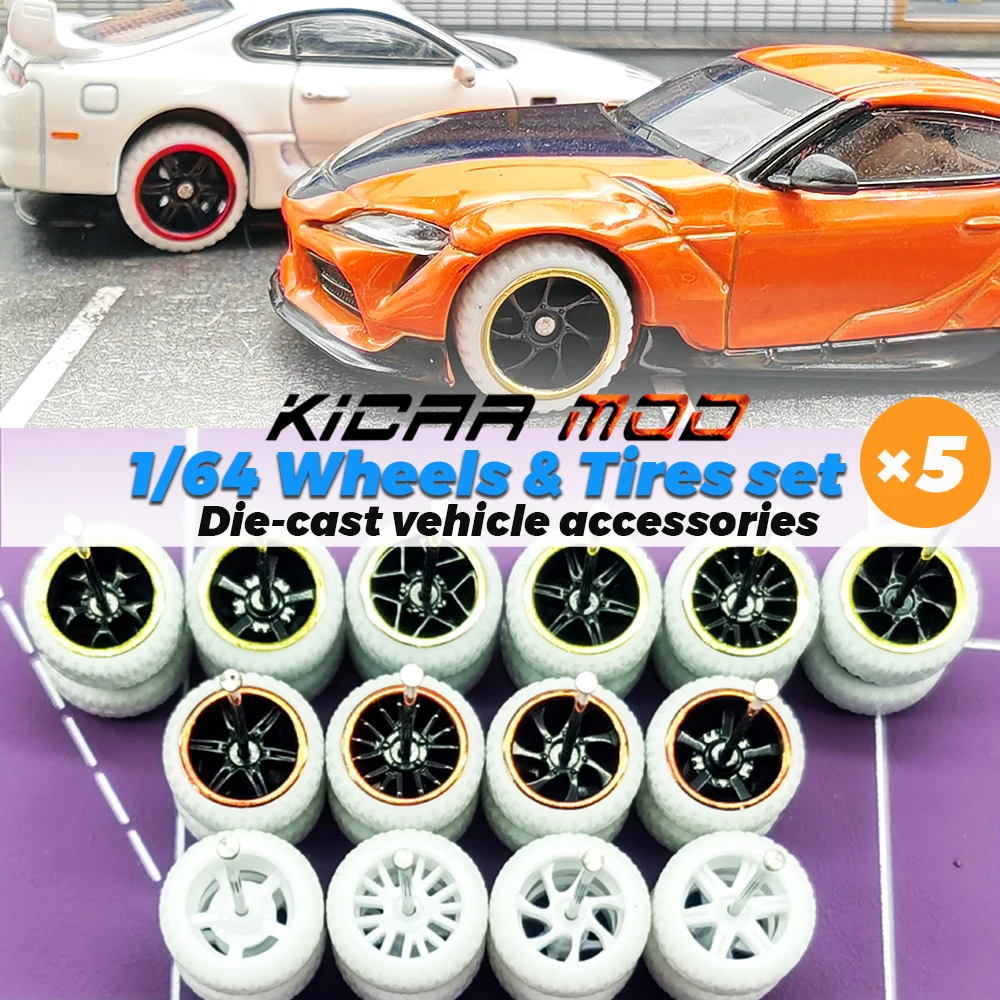 KicarMod 1/64 Piastic Wheels White Tires Colorful Vehicle Toy Wheels for 5 Cars Hot Wheels Hobby Modified Parts 5 set/pack
