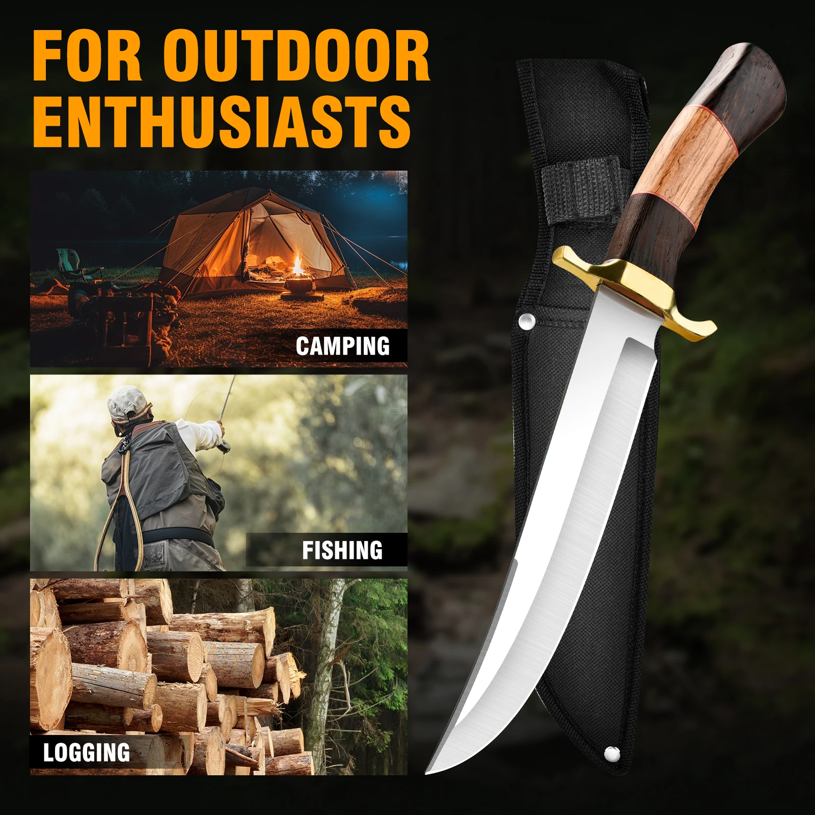 1Pc Stainless Steel Fixed Blade Knife with V-Grind Edge, Straight Back Blade, Wood Handle, and Sheath - Ideal