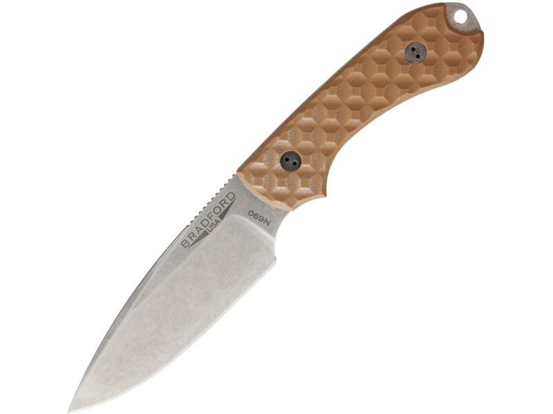 Bradford Knives Guardian3 EDC Coyote Brown Fixed Blade Knife 3.5in Stonewash Brown G10 Handle 1124 3FE-004-N690. 3 1/2" stonewash finish N690 stainless false edge blade. Full extended tang with lanyard hole. Textured brown G-10 handles. Brown...  Read more