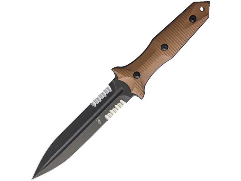 Bastinelli Creations Grozo Fixed Blade Coyote Knife 11in Overall 6in Black SW Partially Serrated N690 SS Spear Point Blade Coyote Brown G10 Handle