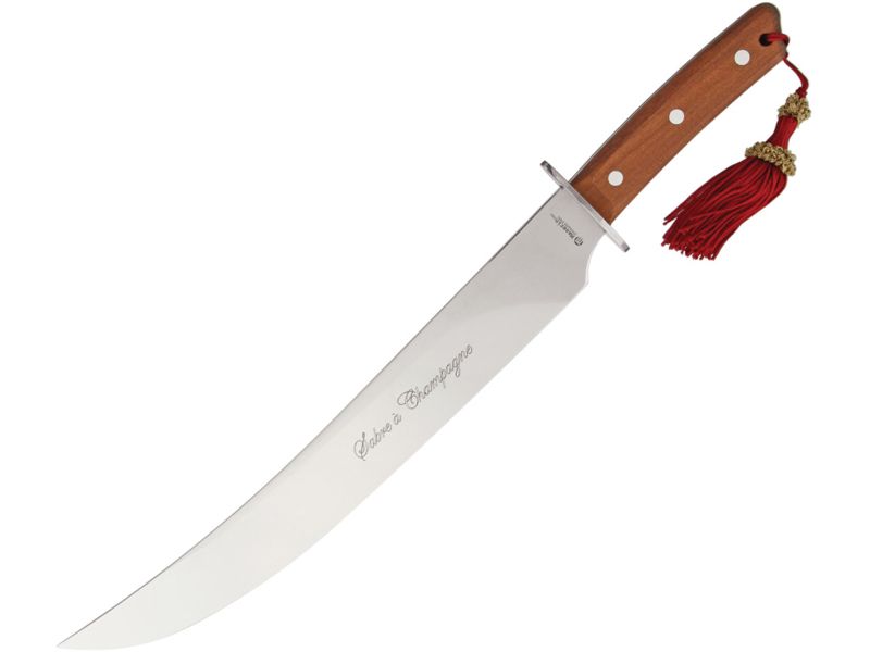 Maserin Champagne Saber Fixed Blade Knife 13.5in Brown Wood Handle 2000SC12. 5"; Blade: 13.5" l Stainless; Handle: Brown l Wood; Other Info: Full Tang. Unsharpened blade. Bubinga wood handles with stainless guard and maroon tassel. Wooden storage...  Read more