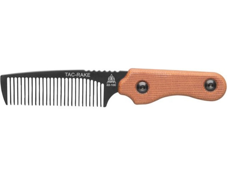 TOPS Knives Tac Rake Beard Comb by Leo Espinoza 5.88in Overall Tan Canvas Micarta Handle Leather Sheath TRAK-01. 88in overall. Black traction coated comb. Tan canvas micarta handle. Designed by Leo Espinoza. Specifications for TOPS Knives Tac Rake...  Read more