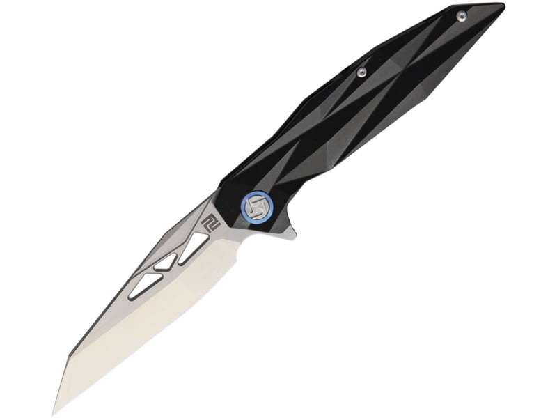 Artisan Cutlery Cygnus Framelock Folding Knife 4.88in Closed 3.5in Satin S35Vn SS Blade Black Sculpted Titanium Handle Pocket Clip Metal Tin Black