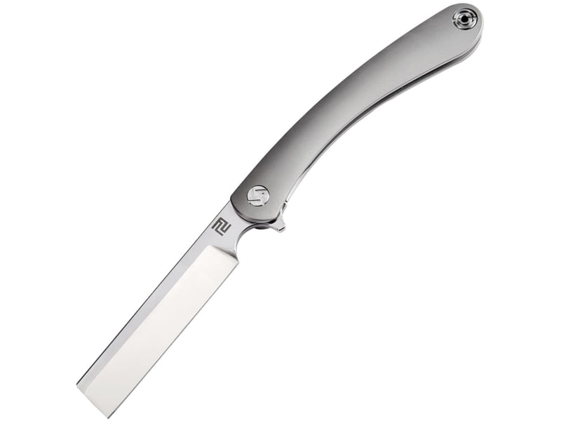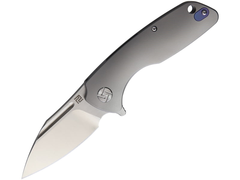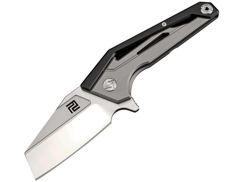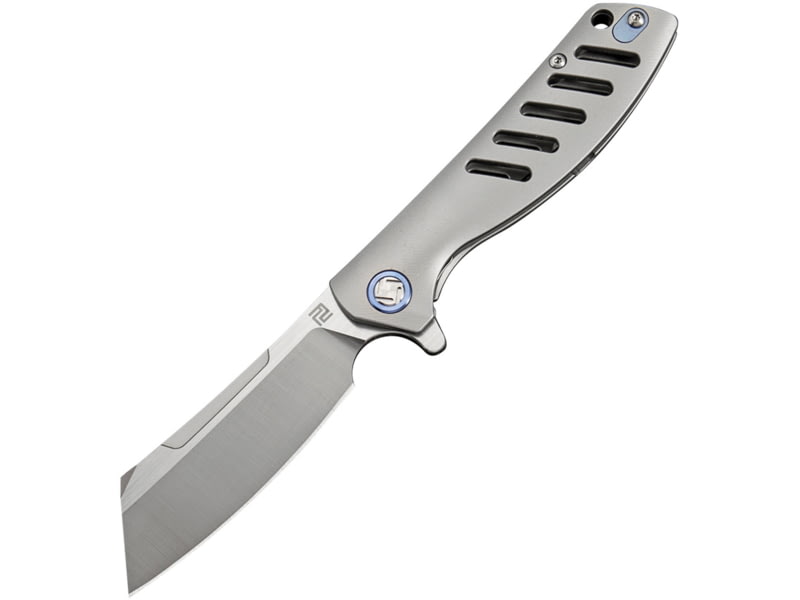 Artisan Cutlery Tomahawk Framelock Folding Knife 4in Closed 3in Satin Bohler M390 SS Blade Gray Titanium Handle Pocket Clip Metal Tin Black Nylon