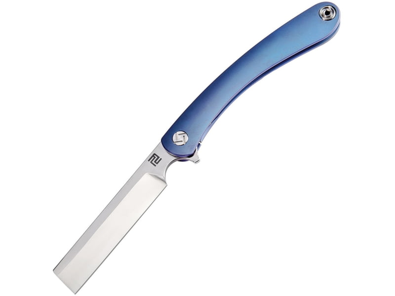Artisan Cutlery Tomahawk Framelock Folding Knife 4in Closed 3in Satin Bohler M390 SS Blade Blue Titanium Handle Pocket Clip Metal Tin Black Nylon