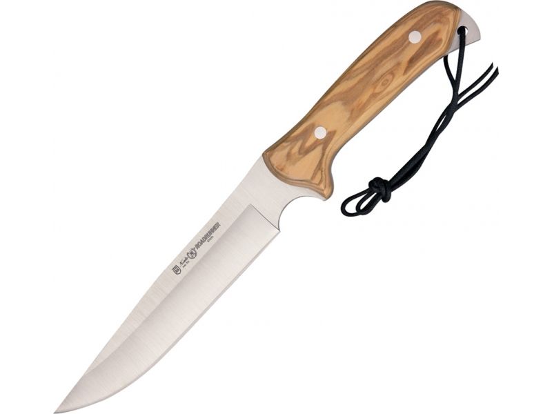 Nieto Cuchillo Roadrunner Fixed Blade Knife SS PE Blade Hardwood Olive handle NIE8904. 6 3/4" Acero AN-58 Inox steel blade with integrated finger guard. Full extended tang with lanyard hole and black twisted cord lanyard. Natural olive wood onlay...  Read more