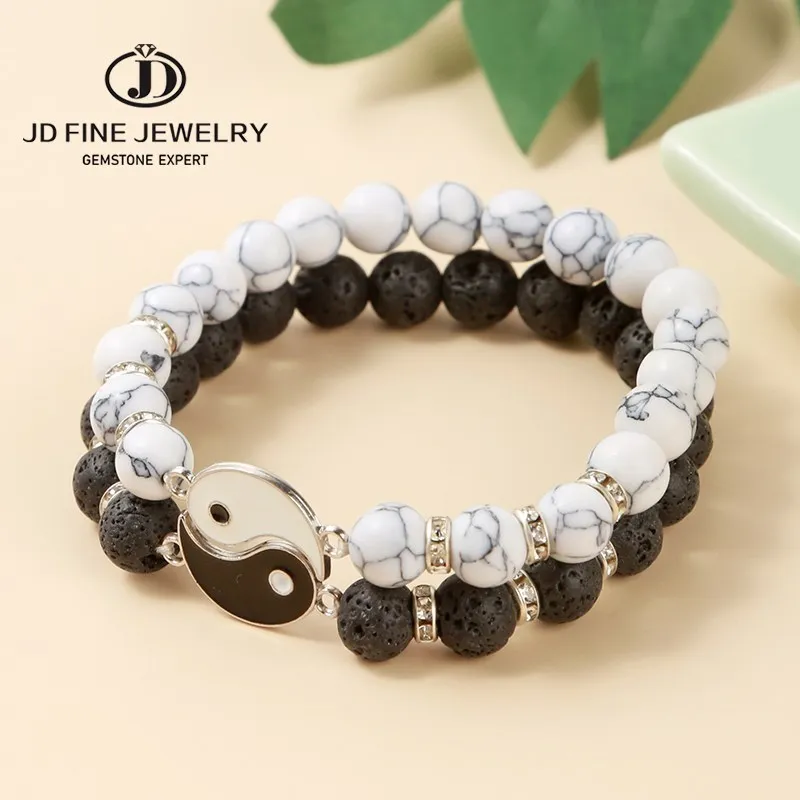 JD Natural Volcanic Lava Stone Tai Chi Yin Yang Couple Bracelets Women Men White Turquoises Round Beads Handmade Lovers Jewelry