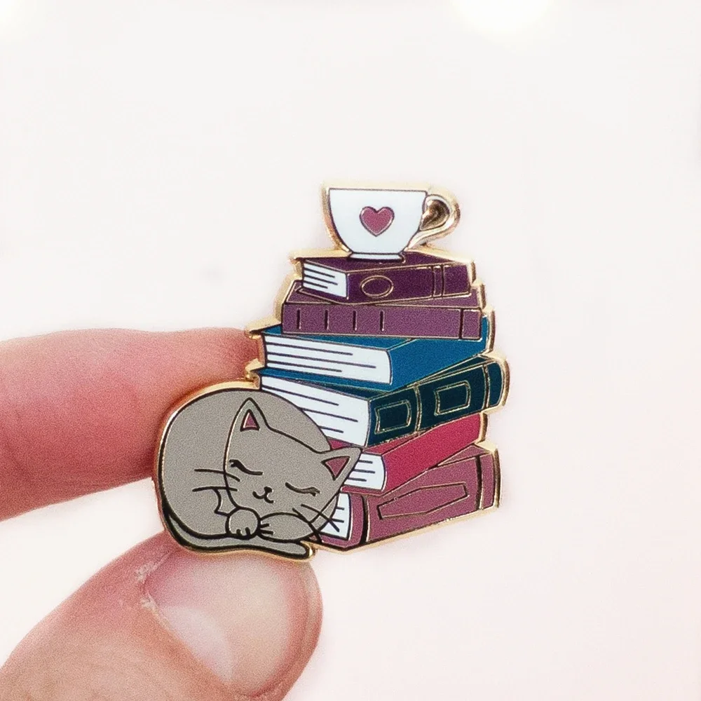 Cute Cartoon Cat Book Stack and Teacup Hard Enamel Pin Kawaii Animal Kitty Medal Brooch Fashion Lapel Backpack Pins Jewelry Gift