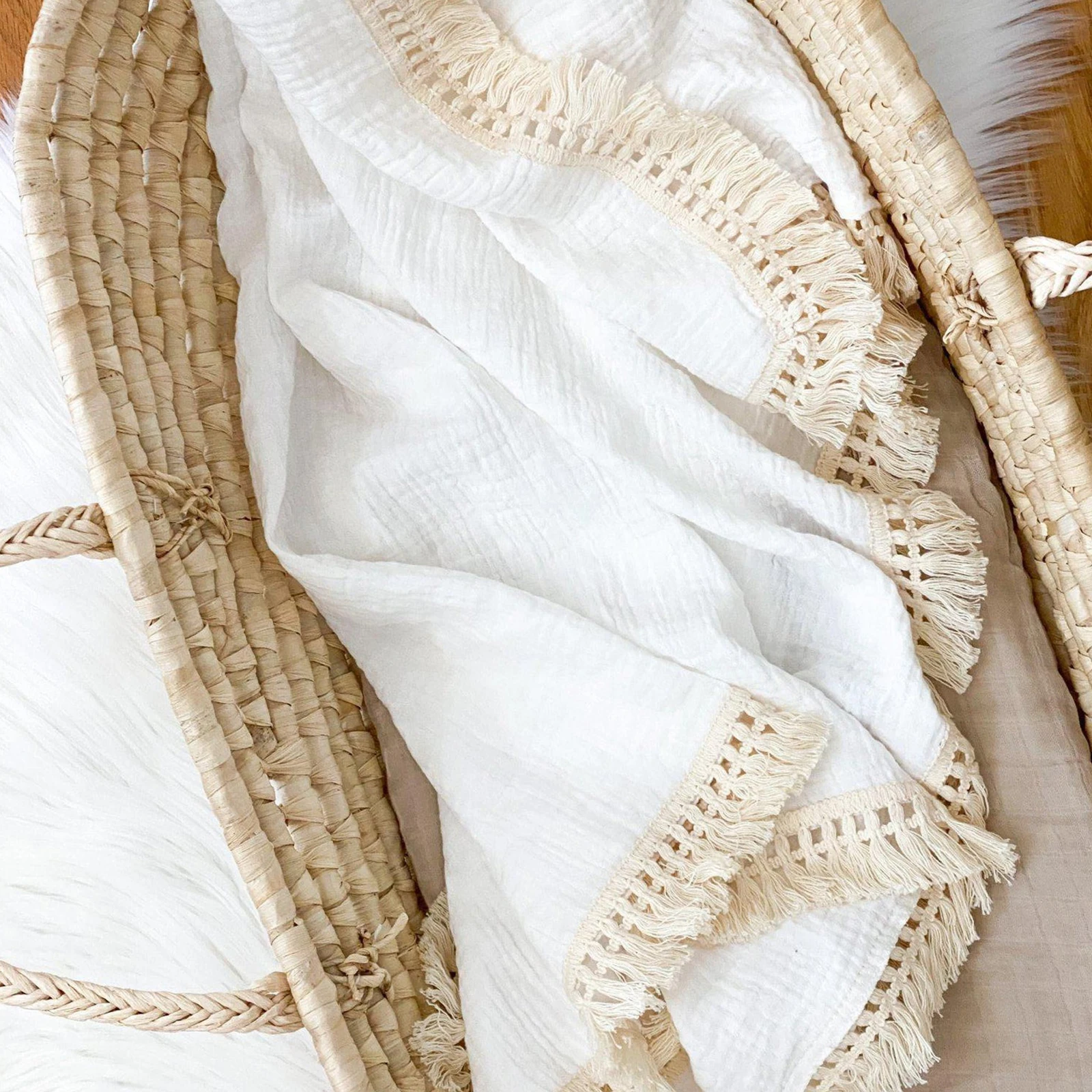 Custom Personalised Solid White Tassel Fringe Muslin Baby Blanket Muslin Swaddle Blanket Baby Receiving Blanket with Fringe