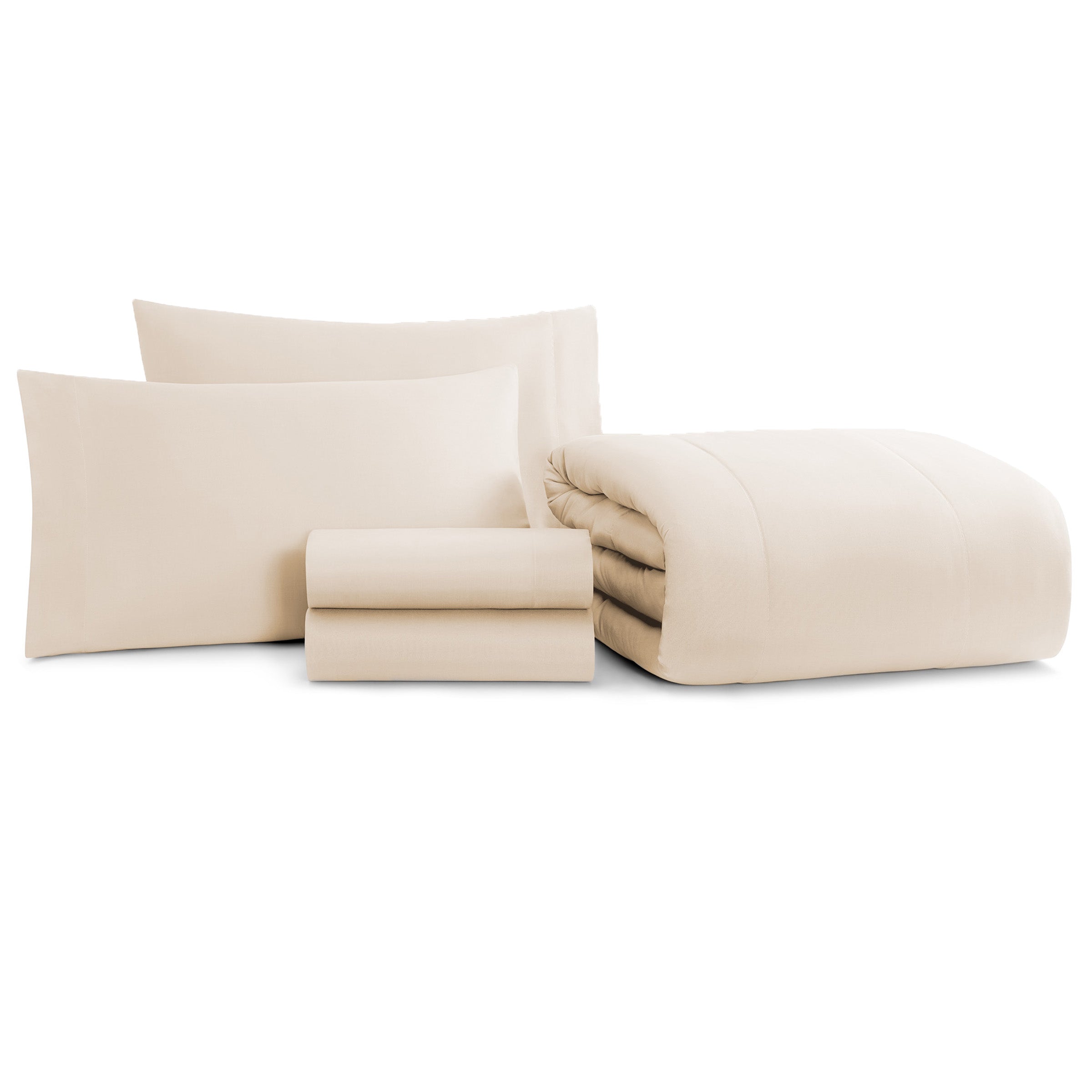 The Family Essentials Bed in a Bag includes a plush comforter, fitted and flat sheet, pillowcases, and shams. It is perfect for home, vacation rentals, or dorm rooms. It is available in six modern, elegant colors in Twin, Full/Queen, and King sizes.
