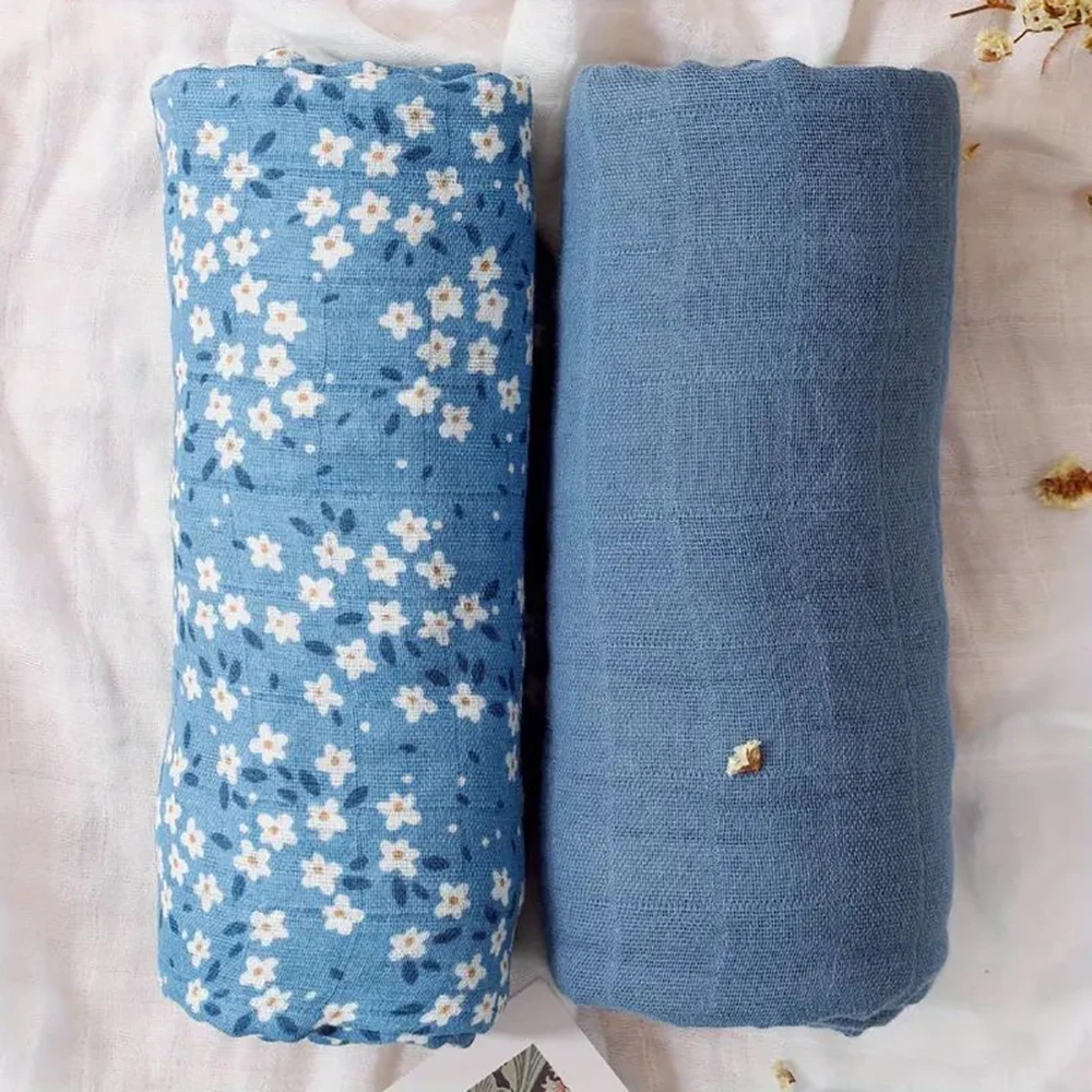 Elinfant 2PCS Popular Print With Solid Color Muslin Swaddle Blankets, Newborn Swaddle Wrap, 100% Cotton Baby Bath Towel