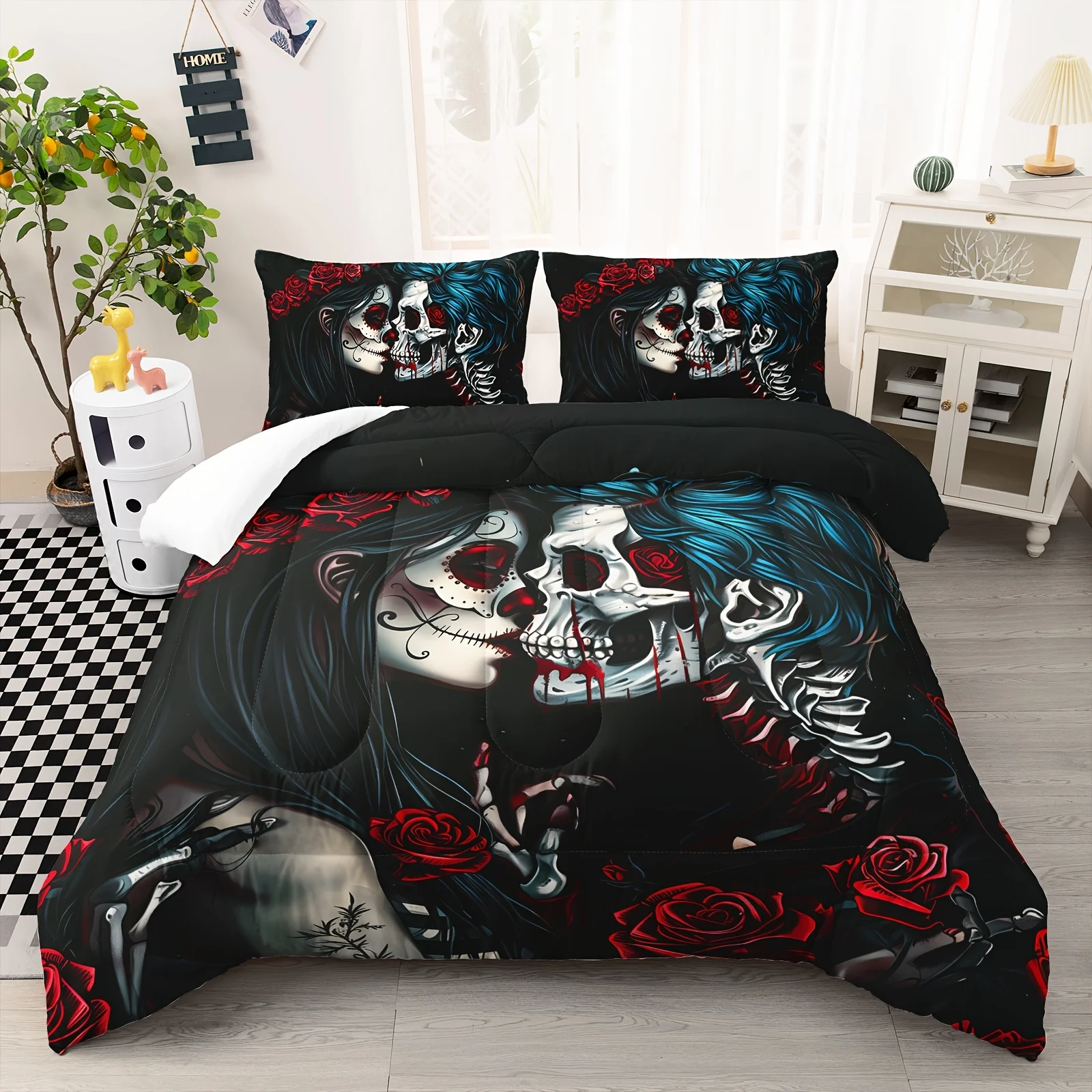 Skull Printed Quilt Set. Polyester Comforter Set with A Dark Black Pattern. It Contains 1 Quilt Set And 2 Pillowcases.