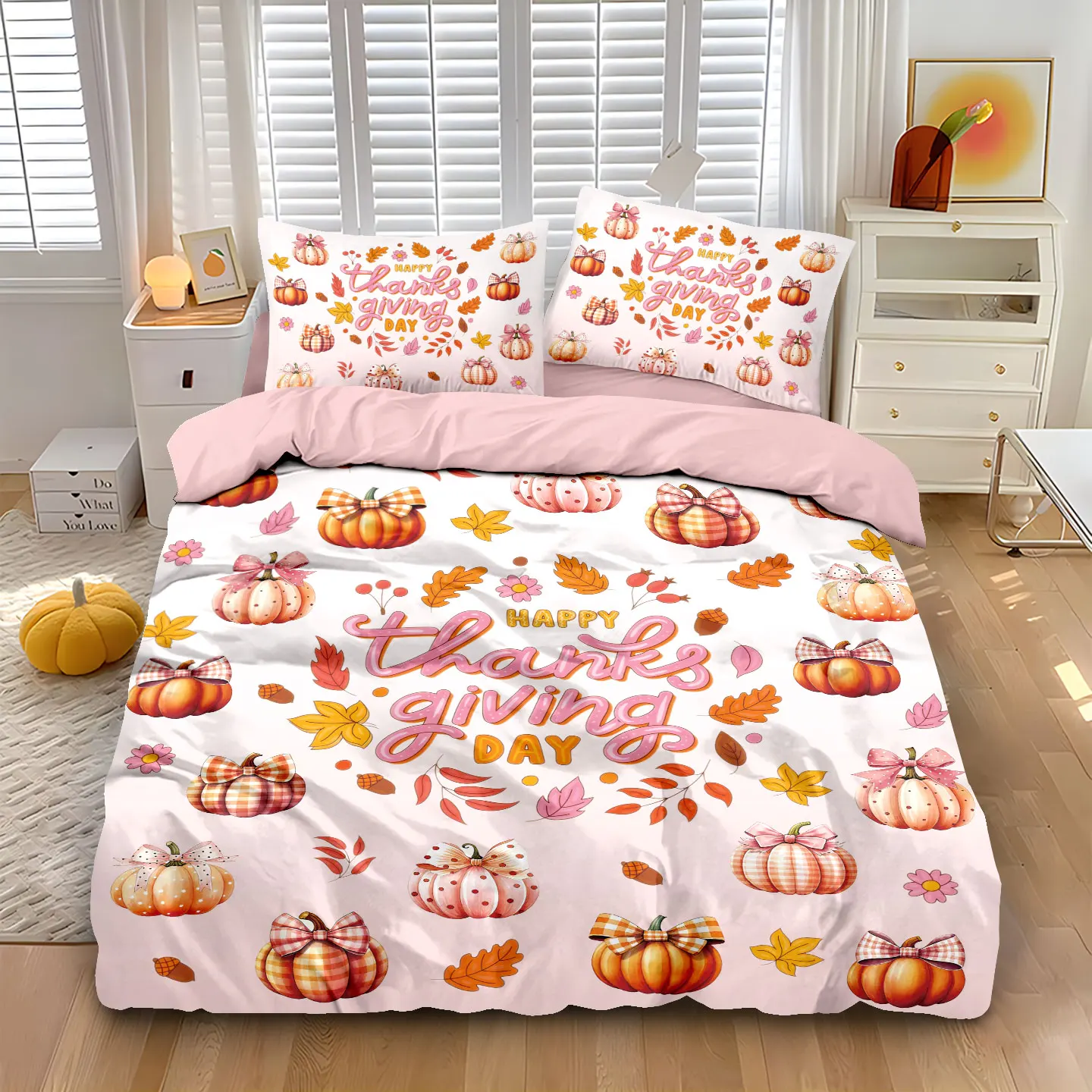3pcs Pink Autumn Harvest Pumpkin Print Quilt Set with Coreless Multi Size Bedrooms Dormitories Soft Comfortable Machine Washable