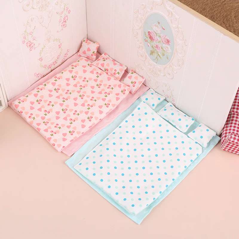 1Set 1:12 Dollhouse Miniature Bed Four Piece Bed Set Bed Sheet Quilt Pillow Quilt Cover Bedroom Bedding Model Decor Toy