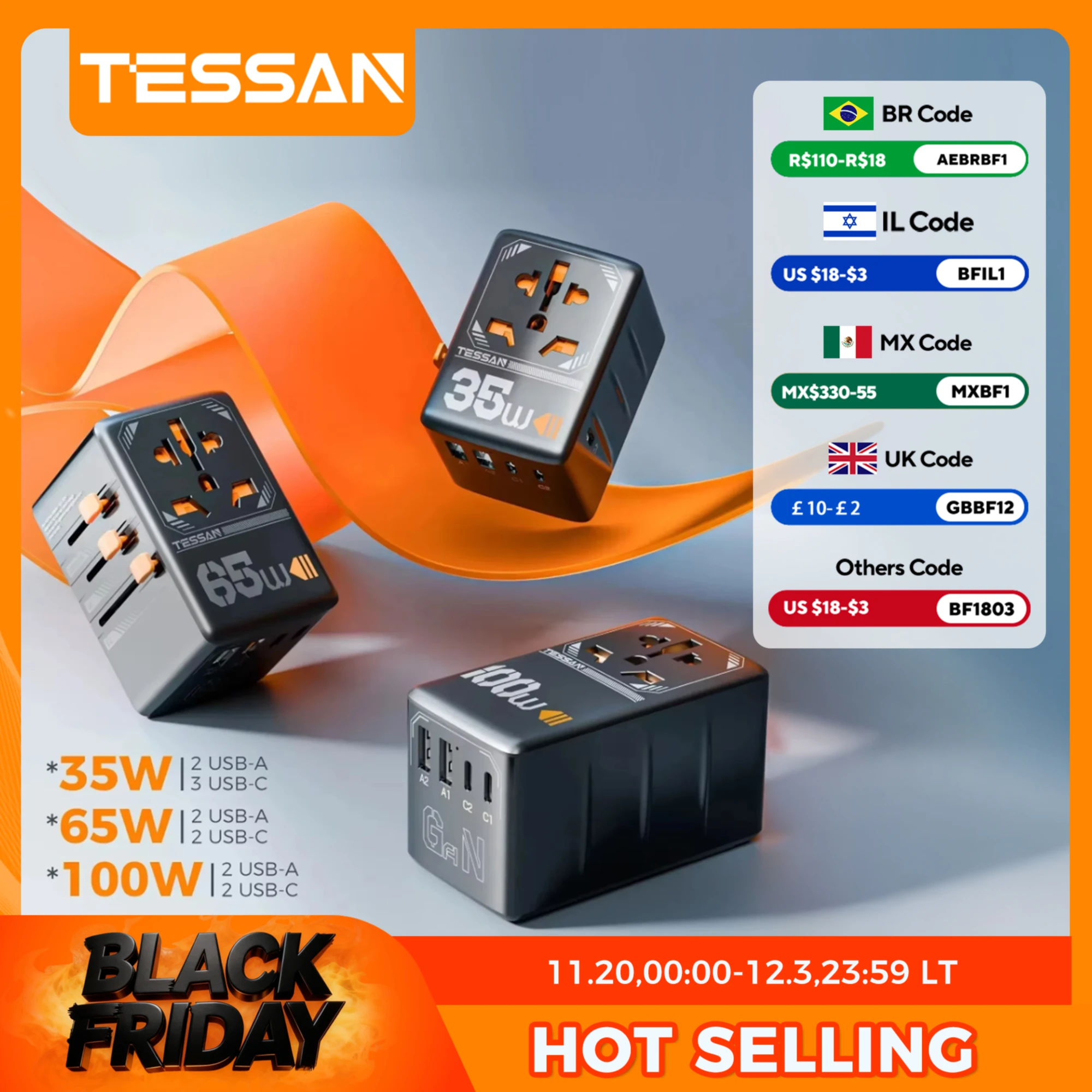 TESSAN 100W GaN Universal Travel Adapter with USB &Type C Fast Charging International Plug Adapter EU/UK/USA/AUS Plug for Travel