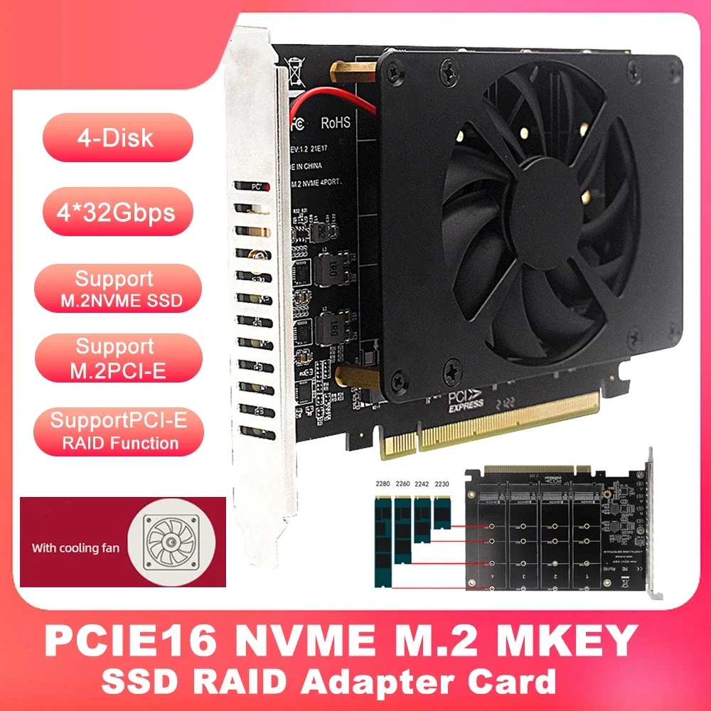 NVME M.2 MKEY SSD RAID Adapter Card Motherboard 4-Disk with Cooling Fan PCIe 4.0 X16 Switch To 4 Ports Split Card 4 X 32Gbps
