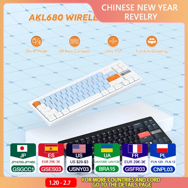 AJAZZ AKL680 65% Mechanical Gaming Keyboard Ultra-slim Wireless 2.4G Bluetooth 5.1 Low Profile Keyboard for Mac Windows Laptop