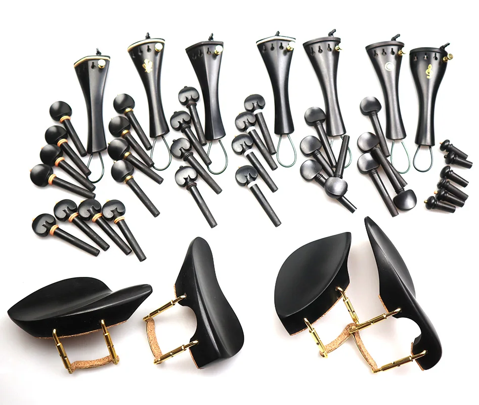 Carved Ebony Wood Violin Parts Accessories, Pegs/Tailpiece/Endpin/Chinrest with Clamp Cork Tail Gut Fine tuner 4/4 Size