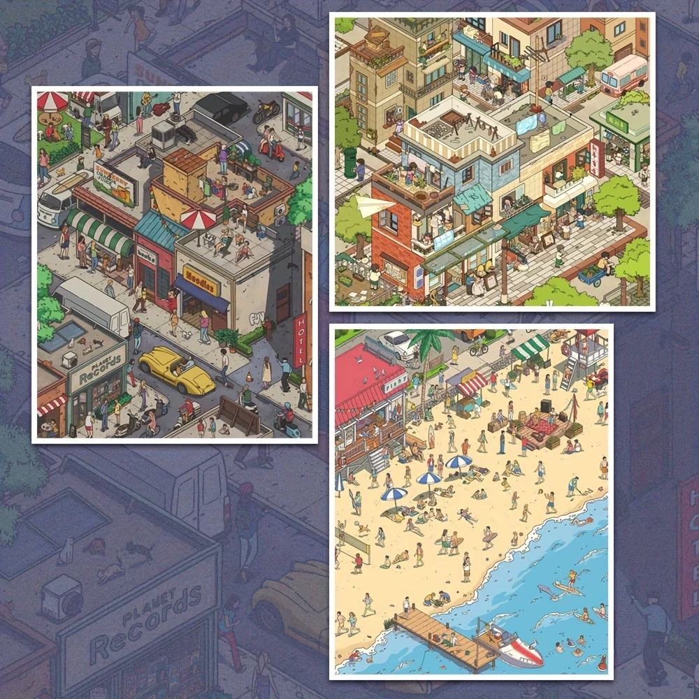 Cartoon Miniature Scene 3D Landscaping Stickers vintage cityscape Urban streetscape and beach party stickers Gift for Kid Child