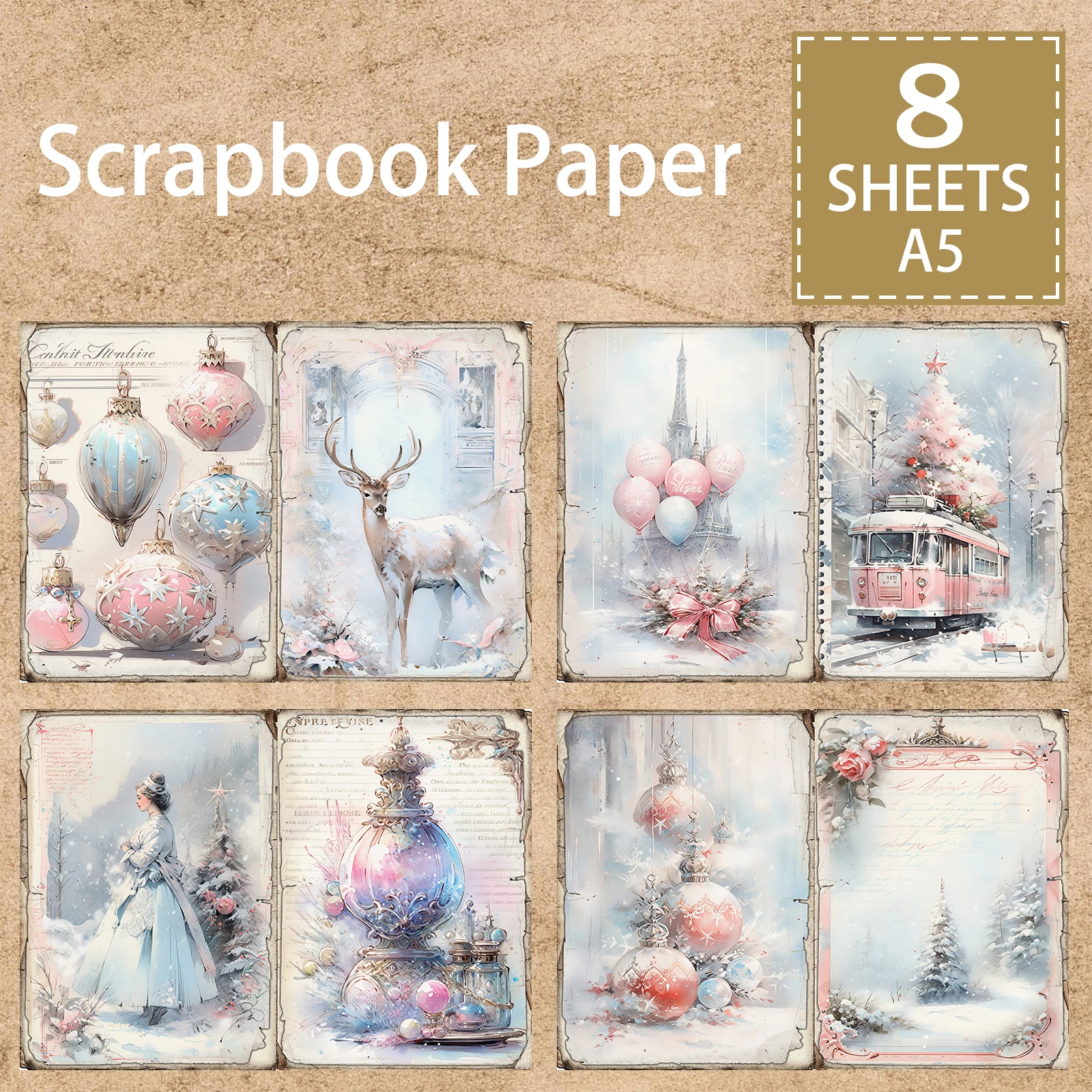 8 Sheets A5 Size Pink Themed Christmas Decoration Elk Train Balloons Vintage Grunge Journal Planning Scrapbooking