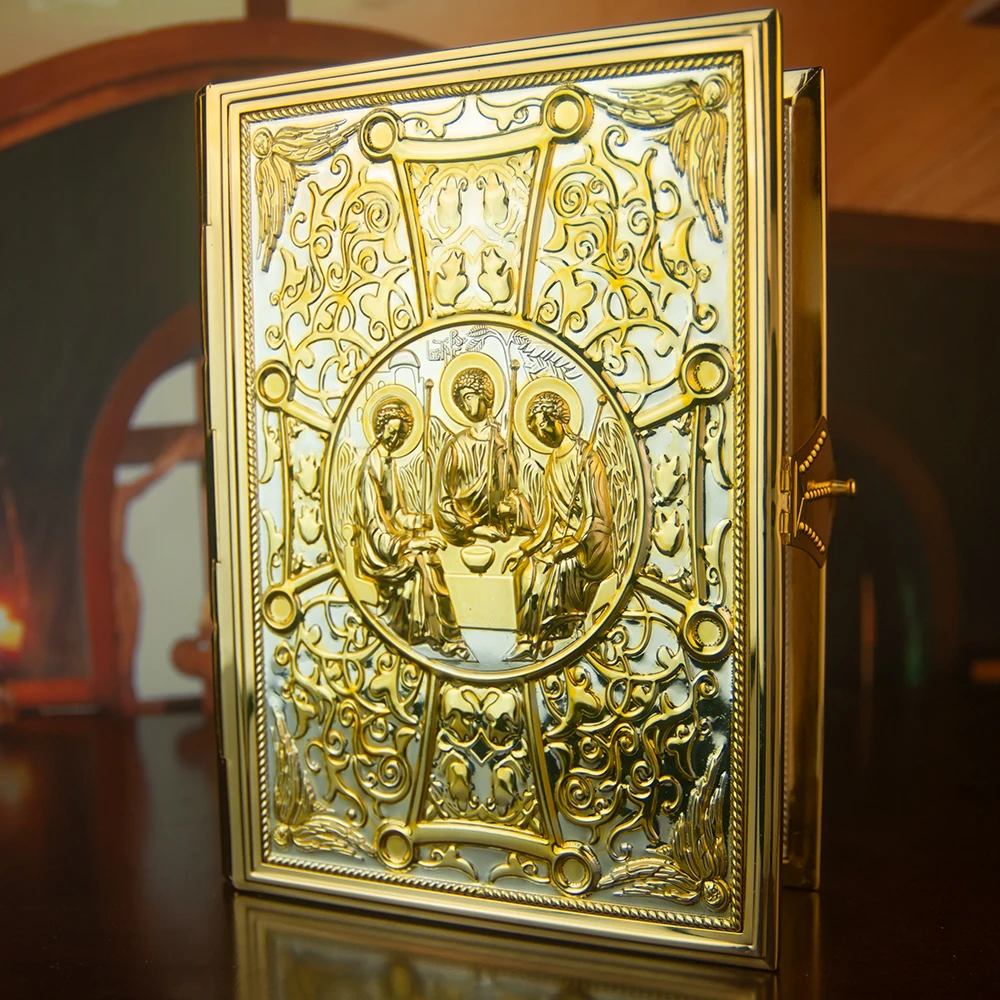 HTISOK Orthodox Bible Book Cover Gold Plated Enamel with Trinity Icon Liturgical Religious Book Case Orthodox Bible Book Cover
