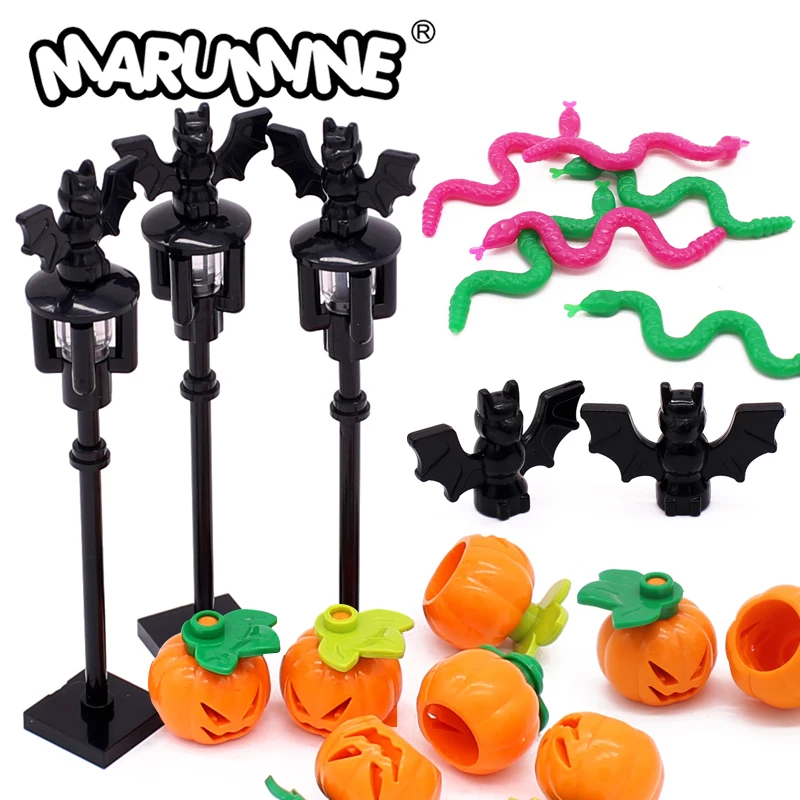 Marumine Halloween MOC Bricks Accessories Pumpkin Bat Snake 30103 20693 30115 Street Lamp Animals Classic Build Blocks Parts