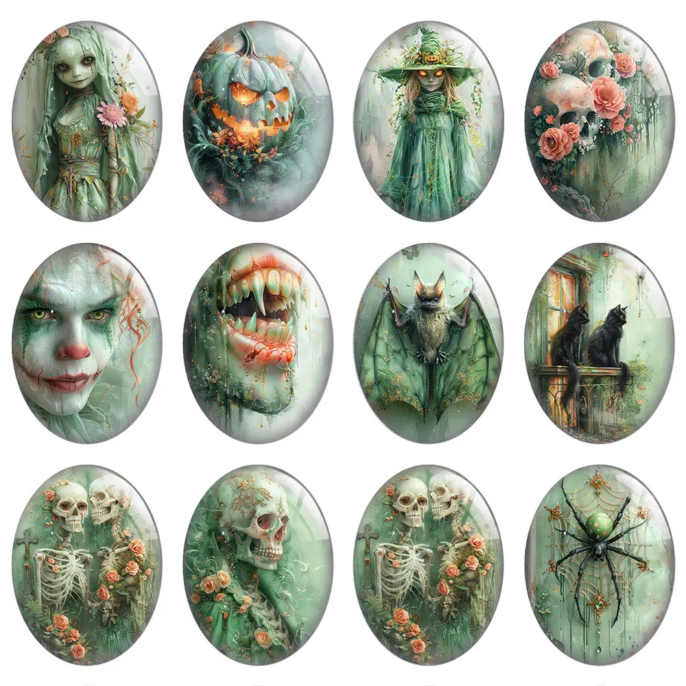 10pcs/lot Halloween Green Horror Gothic Death SKull Flower Oval Photo Glass Cabochon Flatback Demo Cameo For Diy Jewelry Making