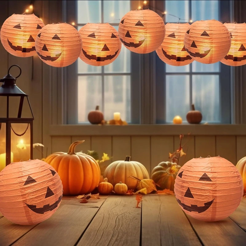 10PCS Halloween Hanging Lanterns - 8" Jack-O'-Lantern, Spider & Skeleton Paper Decor for Indoor/Outdoor Party Lighting