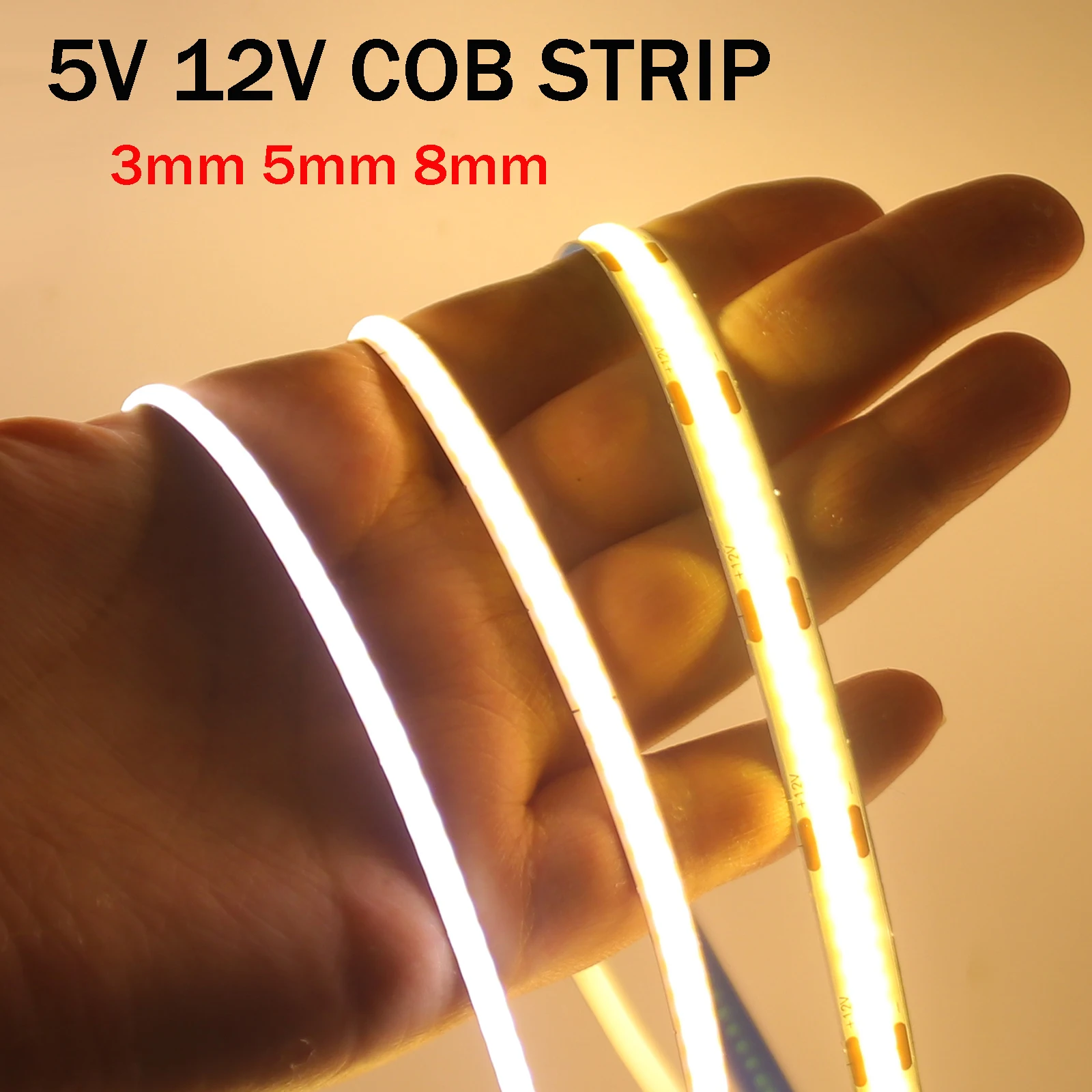 DC5V USB COB LED Strip 3mm 5mm 8mm Width 12V 320LEDs Flexible LED Strip Light with Adhesive High Density Linear Lighting