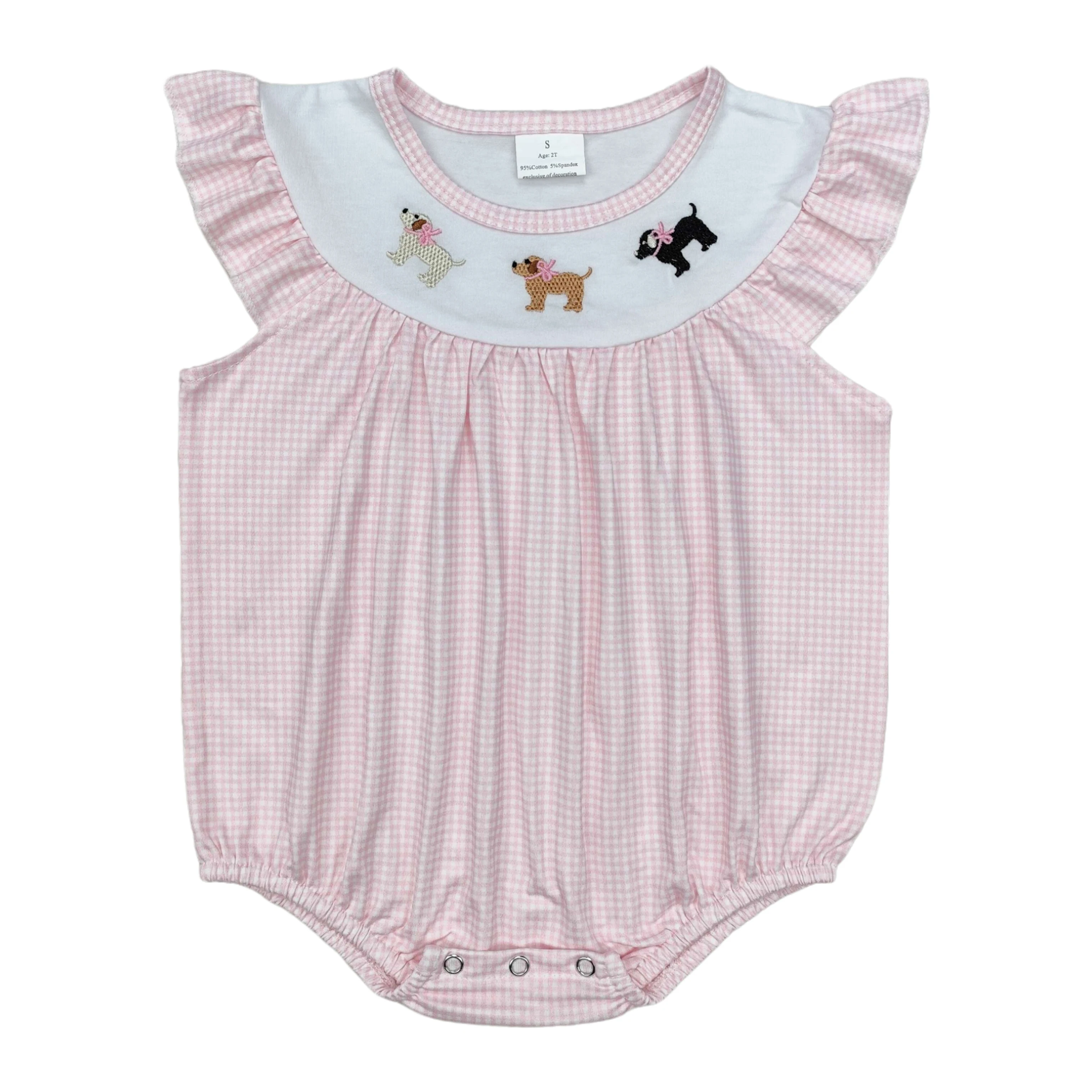 Wholesale Newborn Toddler Embroidery Bows Dogs Baby Girl Short Sleeves Bubble Romper Kids Children Smocked Pink Checked Jumpsuit