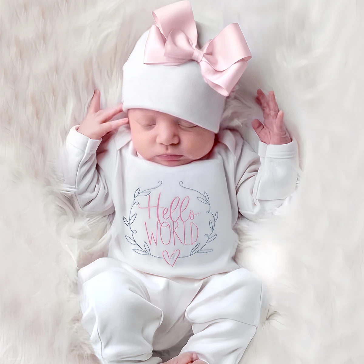 Ylsteed Newborn Romper Jumpsuit with Bow Hat 'Hello World' Embroidery Infant Photography Props for Coming Home Outfit Baby Gift