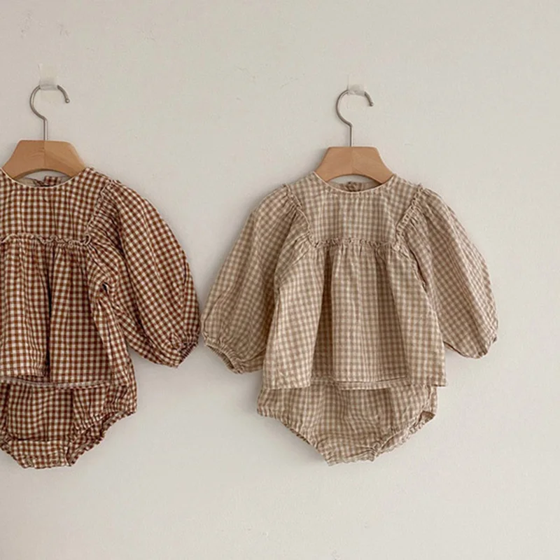 Baby Girls Suit 2022 Baby Girls Clothes Little Plaid Infant Girls Clothes Set Puff Sleeve Blouse + Bloomer 2pcs Toddler Clothes
