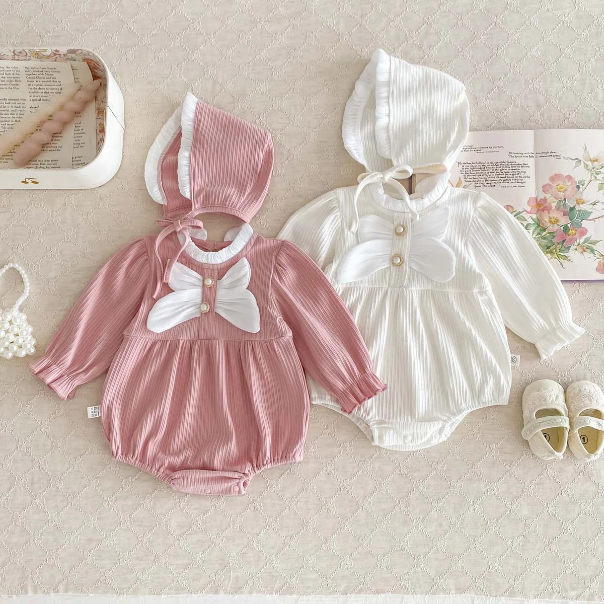 Autumn Baby Romper with Hat Big Bow Standing Collar Long Sleeve Infant Girl Bodysuit Full Moon Photo Baby Clothes Sweet
