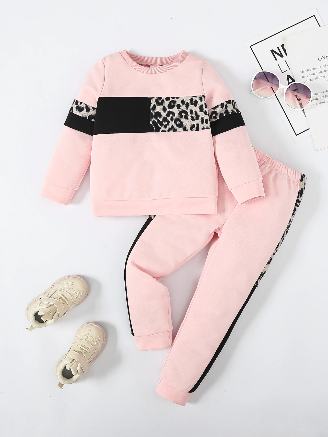 Boys And Girls Set Round Neck Long Sleeve Loose Top Leopard Pattern Pants Elastic Waist Home