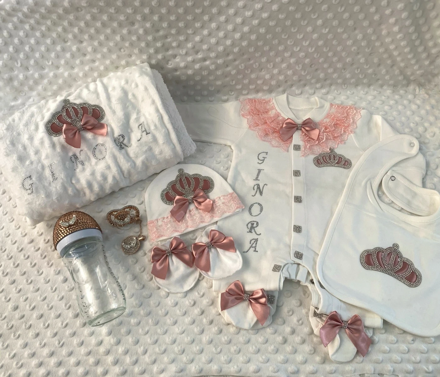 Baby Girl Boy Princess Prince Hospital Exit Newborn Bling Outfits Baby Bottles Gift Set Baby Shower Gift 5pcs Crown Romper