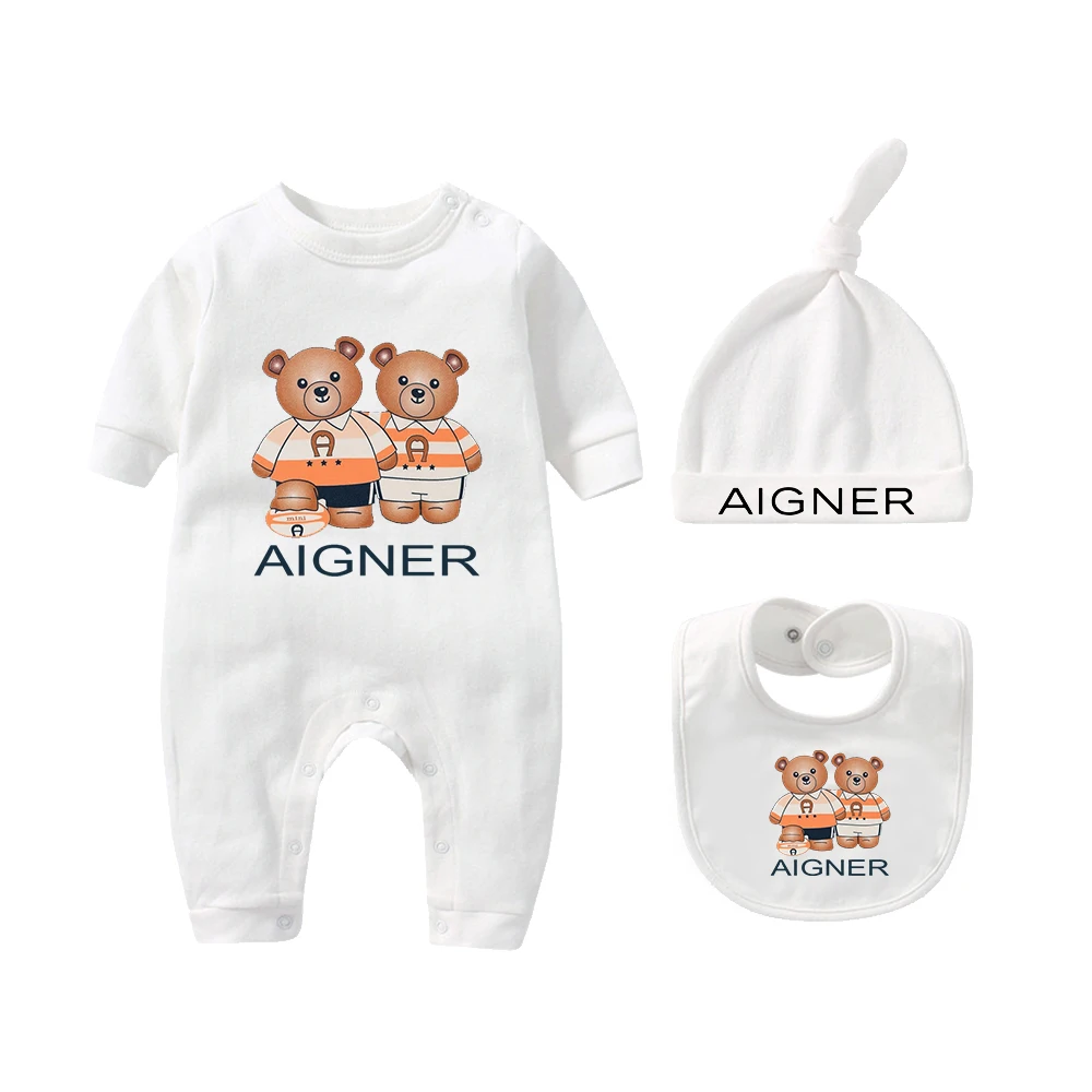 Popular bear jumpsuit, newborn autumn clothing hot selling, soft bib scarf hat, toddler jumpsuit set, baby long sleeved jumpsuit