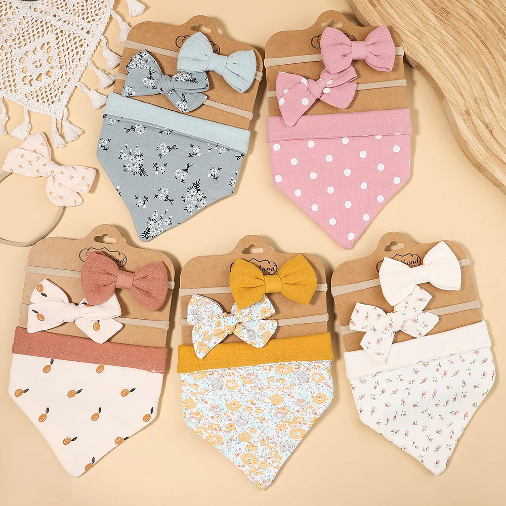 3Pcs/Set Muslin Cotton Baby Bib Newborn Bows Headband Triangle Print Saliva Towel Infant Boy Girl Feeding Burp Cloth Shower Gift