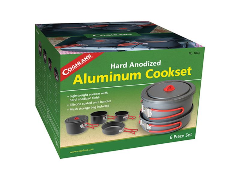 Coghlans Hard Anodized Family Cook Set. The set includes 3 pots and a frying pan as well as a unique lid that fits all 4 pieces has drain holes incorporated into it and has a stay-cool silicone knob. It all nests together and comes with a mesh bag...
